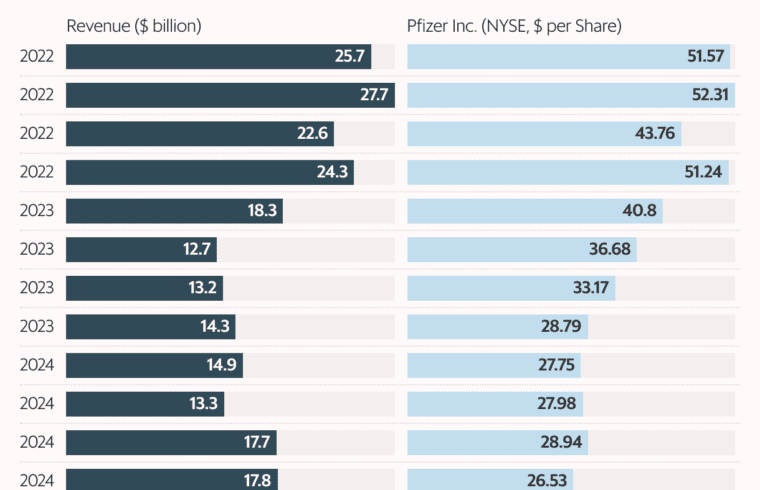 But as the pandemic ebbed, Pfizer’s covid portfolio sales dwindled from a peak of $56 billion in 2022 to $9 billion in 2024. Also, its new deals were not exactly playing out as expected. The sickle cell anemia drug had to be recalled after clinical trials uncovered higher mortality rates, the efficacy of the migraine drugs was nothing to write home about, and Pfizer’s dreams with obesity drugs got sidetracked after discovering serious side effects.