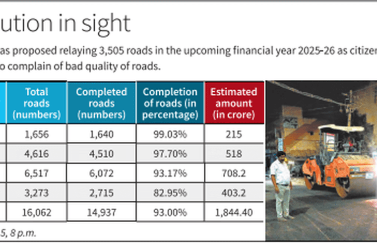The GCC has relaid 14,937 roads out of the 16,062 targeted, completing 82% of the target for relaying —between the financial years 2021-25 for a sum of ₹1,844.4 crore.