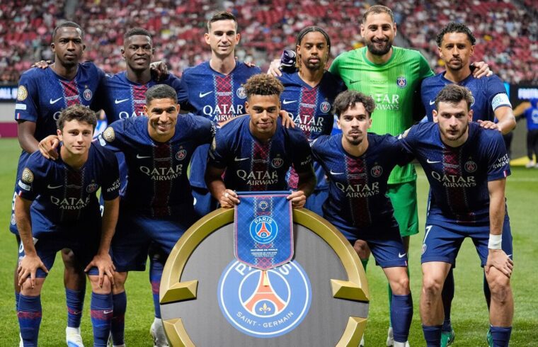 PSG: Donnarumma (GK), Hakimi, Marquinhos, Pacho, Mendes, Neves, Vitinha, F. Ruiz, Doue, Barcola, Kvaratskhelia.