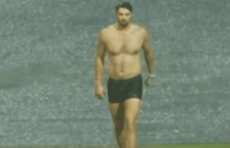 The RCB star, shirtless and wearing only a pair of shorts, indulged in some playful “swimming” as the M Chinnaswamy stadium in Bengaluru was drenched thanks to heavy rain on Thursday.