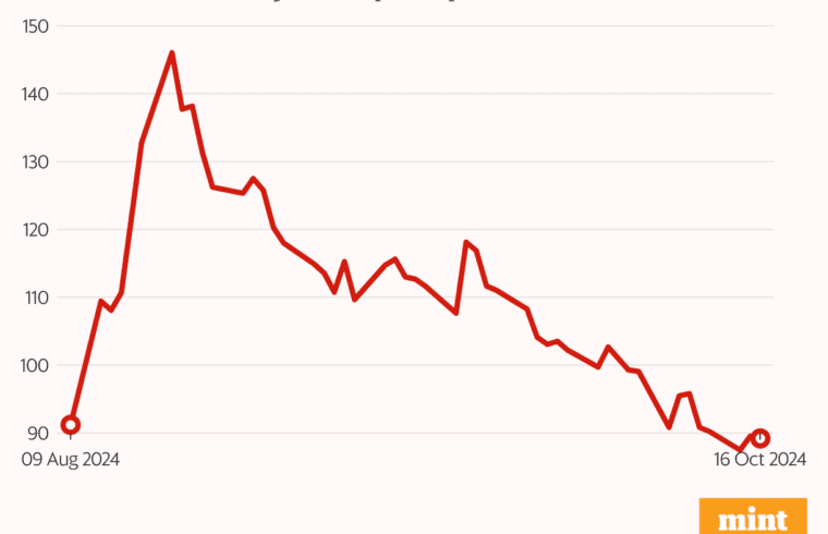 After hitting a high of 146.4 on 19 August, it is currently trading at 85.2, down 41%.